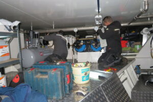 Hulpmotor voormachinekamer eruit om te reviseren en weer terug