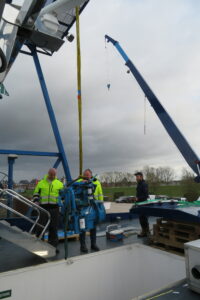 Achter machinekamer luik open. Hulpmotor eruit, reviseren en weer er in takelen (Jan van Hout)