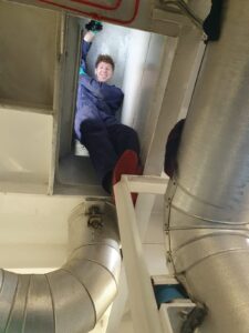 Ik zelf, Marion, op papier in de functie internationaal stuurman. Ik hou de administratie bij.